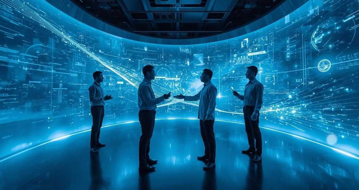 Futuristic digital room with holographic screens symbolizing Mifroom.
